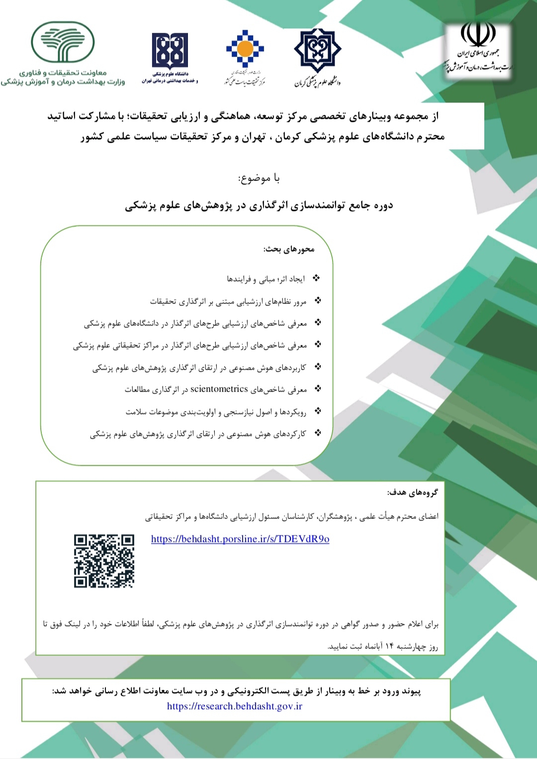 محورهای اصلی دوره:- مبانی و فرآیندهای ایجاد اثر در پژوهشهای علوم پزشکی - مرور نظامهای ارزشیابی مبتنی بر اثرگذاری تحقیقات - معرفی شاخصهای ارزشیابی طرحهای اثرگذار در دانشگاهها و مراکز تحقیقاتی - شاخصهای scientometrics در ارزیابی مطالعات - اصول نیازسنجی و اولویتبندی موضوعات سلامت - نقش هوش مصنوعی در ارتقای اثرگذاری پژوهشها